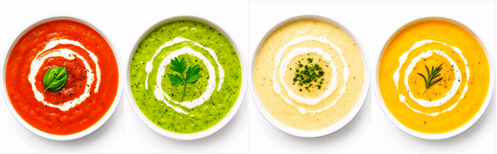 | Désignation | Tomate Basilic Mascarpone | Carotte Curry Coco Coriandre | Potiron Maredsous Paprika | Velouté Vert Persil – sans lactose – | Courgette Carotte Oignon |